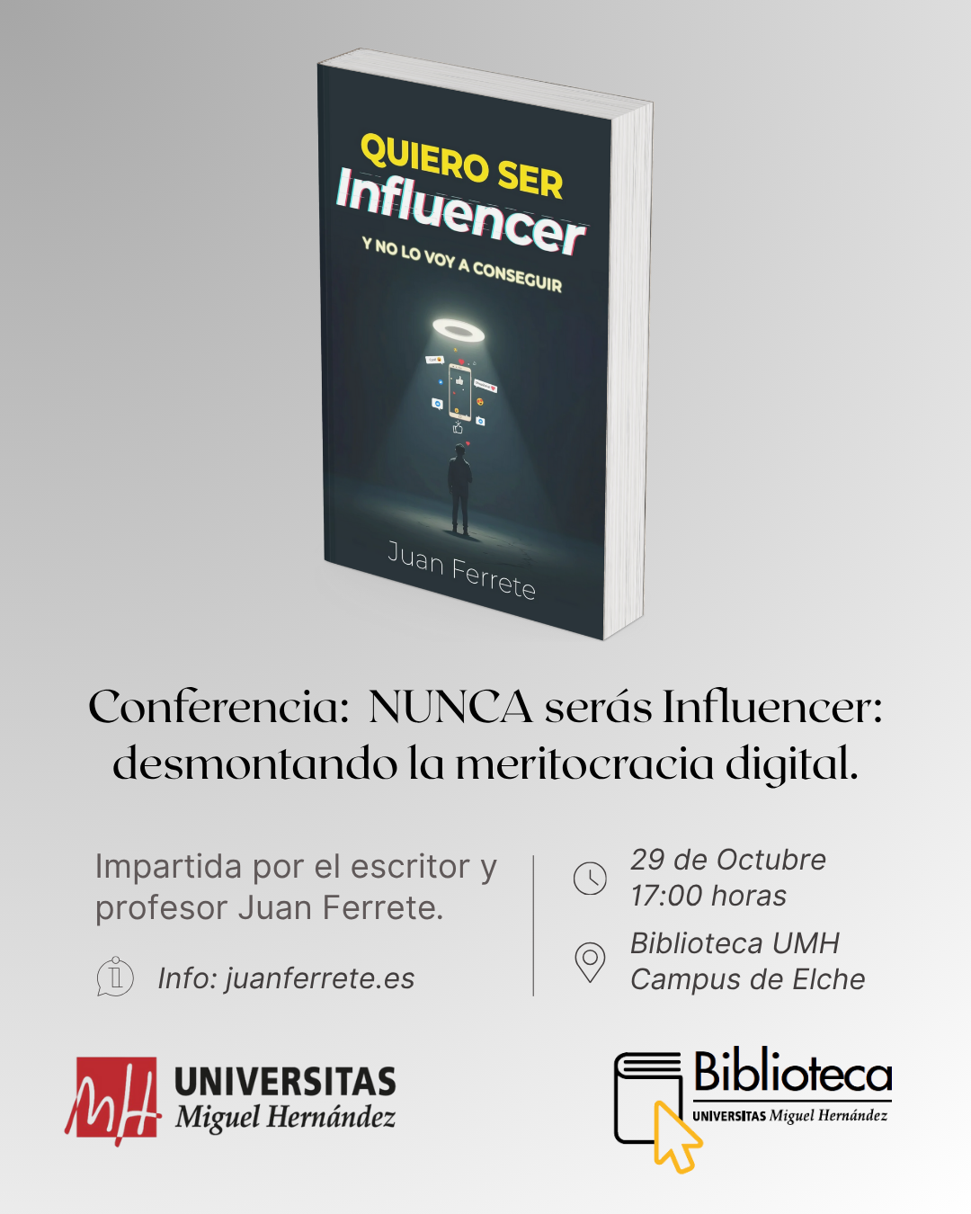 El próximo miércoles 29 de octubre de 2025, a las 17:00 horas, la Biblioteca de la Universidad Miguel Hernández (Campus de Elche) acogerá la conferencia “NUNCA serás Influencer: desmontando la meritocracia digital”, impartida por el escritor y profesor Juan Ferrete. La entrada será libre hasta completar aforo.