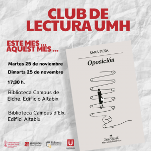 ¿Todavía no te has inscrito al Club de Lectura? Para ello puedes enviar un correo a . Únete a nuestra comunidad de lectores y descubre el placer de la lectura y el diálogo, además puedes reservar tu ejemplar en el catálogo de la Biblioteca UMH.